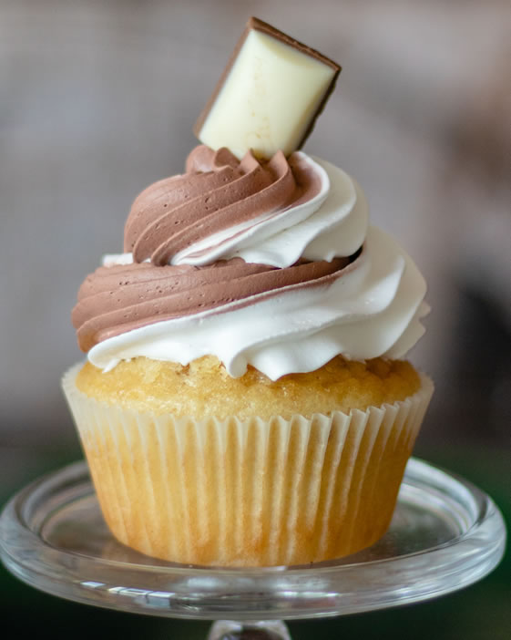 Vanilla sponge filled with white chocolate and topped with a vanilla/chocolate swirl and a small piece of Top Deck chocolate.